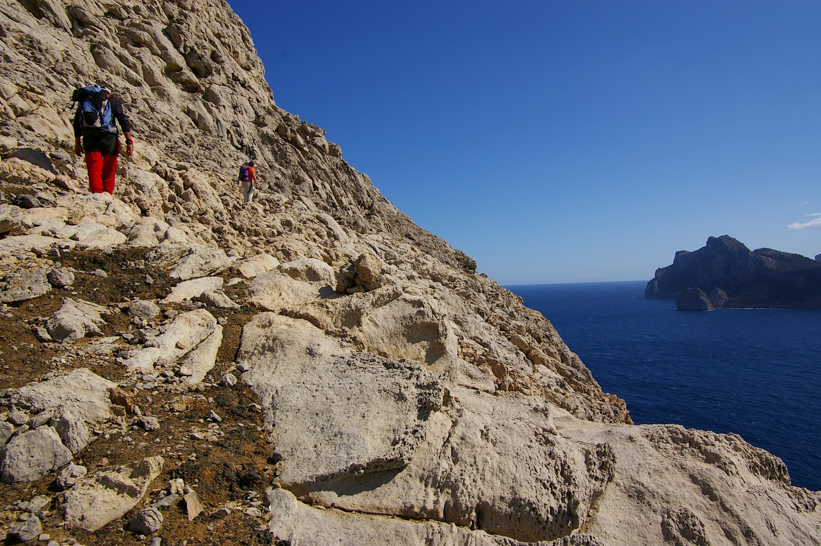 Después de contemplar las vistas iniciamos el descenso por el mismo lugar hasta llegar a la canal, donde veíamos hitos que indicaban dos itinerarios distintos, sin descender la canal derivamos hacia la izquierda para situarnos junto al hito que anteriormente habíamos discriminado. Vemos otros en la lejanía que marcan un trayecto por encima de una ancha balconada sobre las aguas de la cala, a mitad de trayecto pasamos por debajo de una gran oquedad “balma” con las paredes muy pulidas por el agua y el viento, continuamos siguiendo los hitos mientras la ancha cornisa se va estrechando hasta convertirse en una estrecha reprisa de nos más de dos palmos de ancho y en descenso pronunciado que nos sitúa en la base de “sa Trona” o “se Tronera”, así nombrado en algunos mapas del lugar.