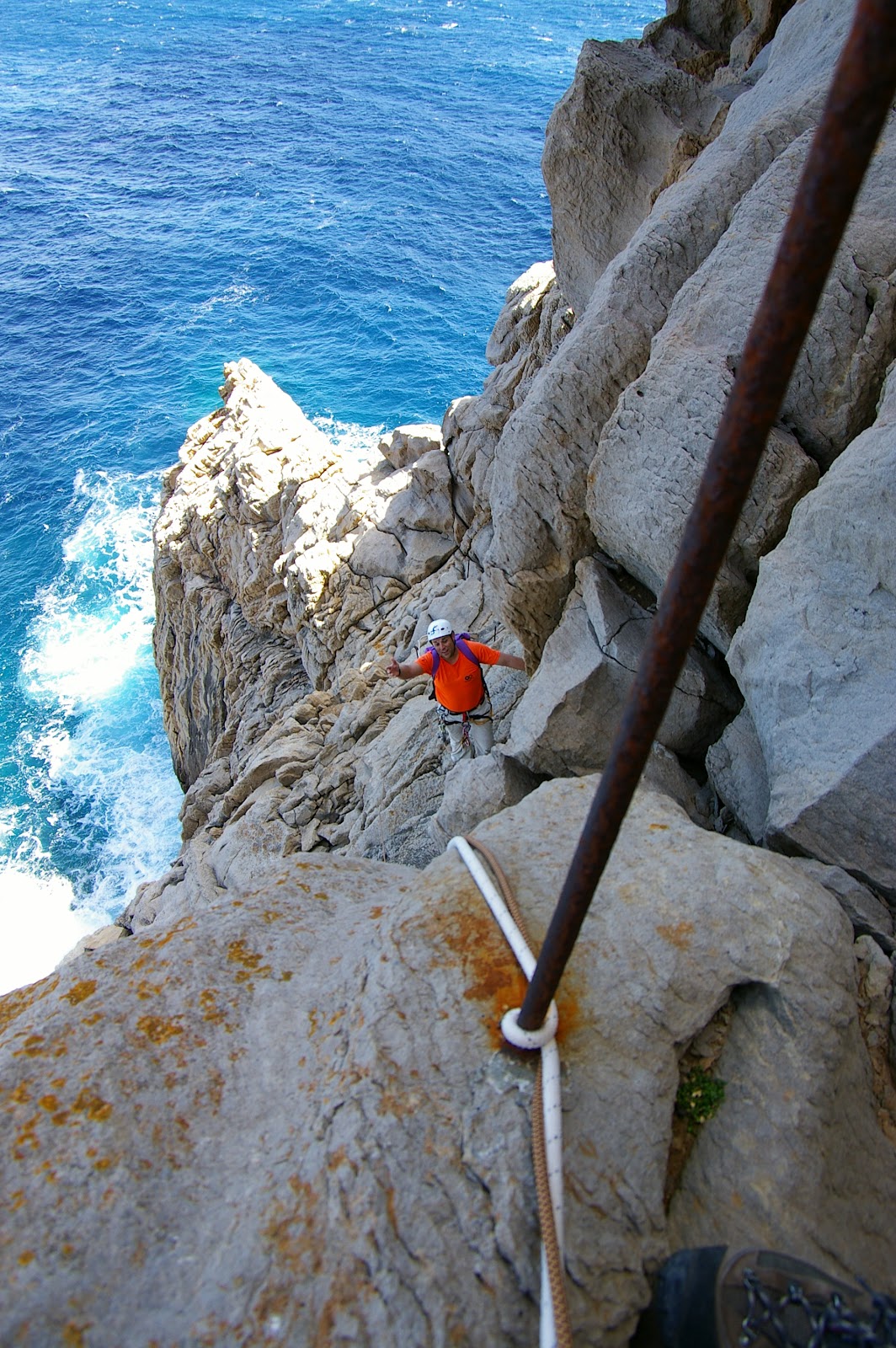 Ahora se trata de equiparse con el arnés y comenzar el destrepe, el primero lleva a cuestas una cuerda que va pasando mediante un giro por la base de las varillas, y otra cuerda que le asegura. El resto va bajando asegurado con cintas y mosquetones a la cuerda anudada a las varillas. De esta manera se va descendiendo hasta llegar a la punta con la seguridad que exige el lugar; en realidad se puede superar sin necesidad de ir cordado o asegurado, pero un tropiezo, una distracción, un vahído inoportuno, haría que nos precipitásemos al vacío, con suerte en el mar, y en esta época el agua todavía esta muy fría, es coña.